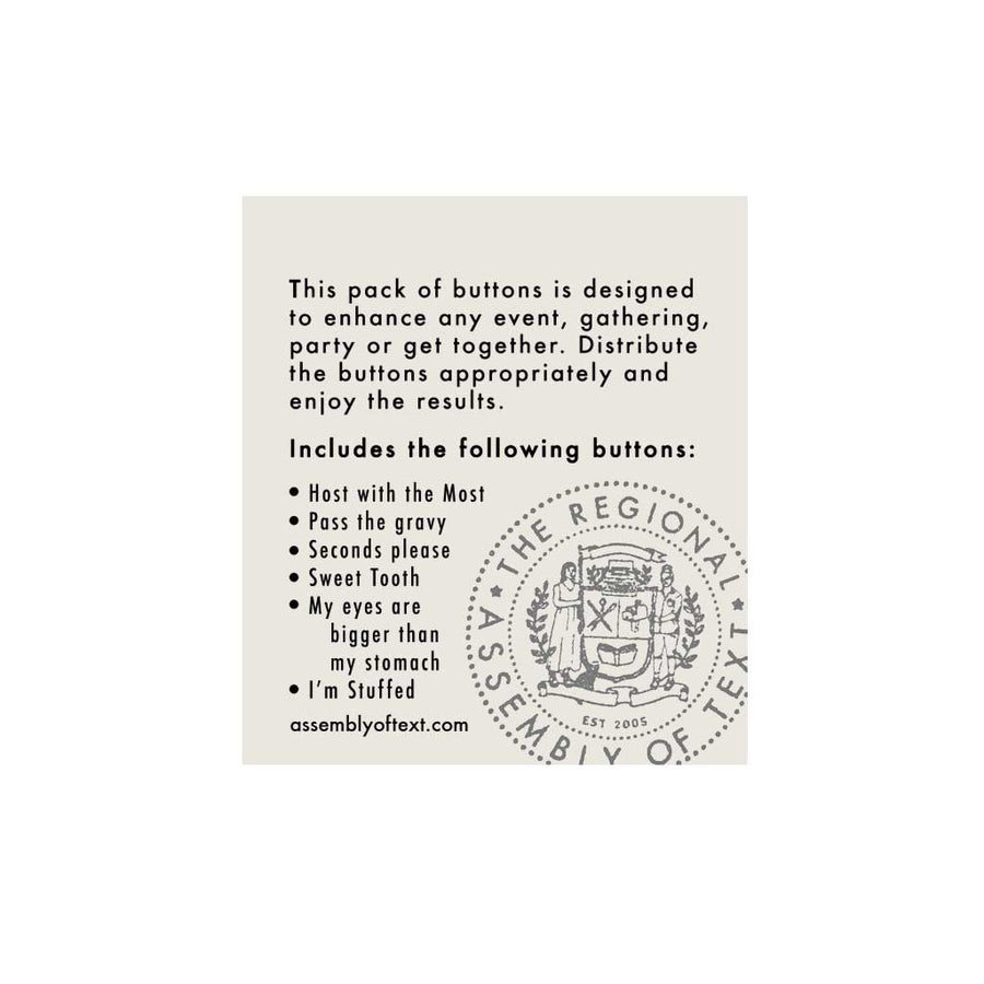 This pack of party pins contains 6 festive buttons to enhance any festive feast. Buttons read.... "host with the most, sweet tooth, pass the gravy, seconds please, my eyes are bigger than my stomach & I'm stuffed. Buttons vary in size. Set measures approximately 3” x 6½”.