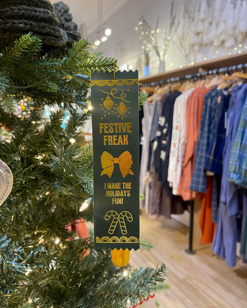 2. Festive Freak: I make the holidays fun! Gold print on forest green ribbon.