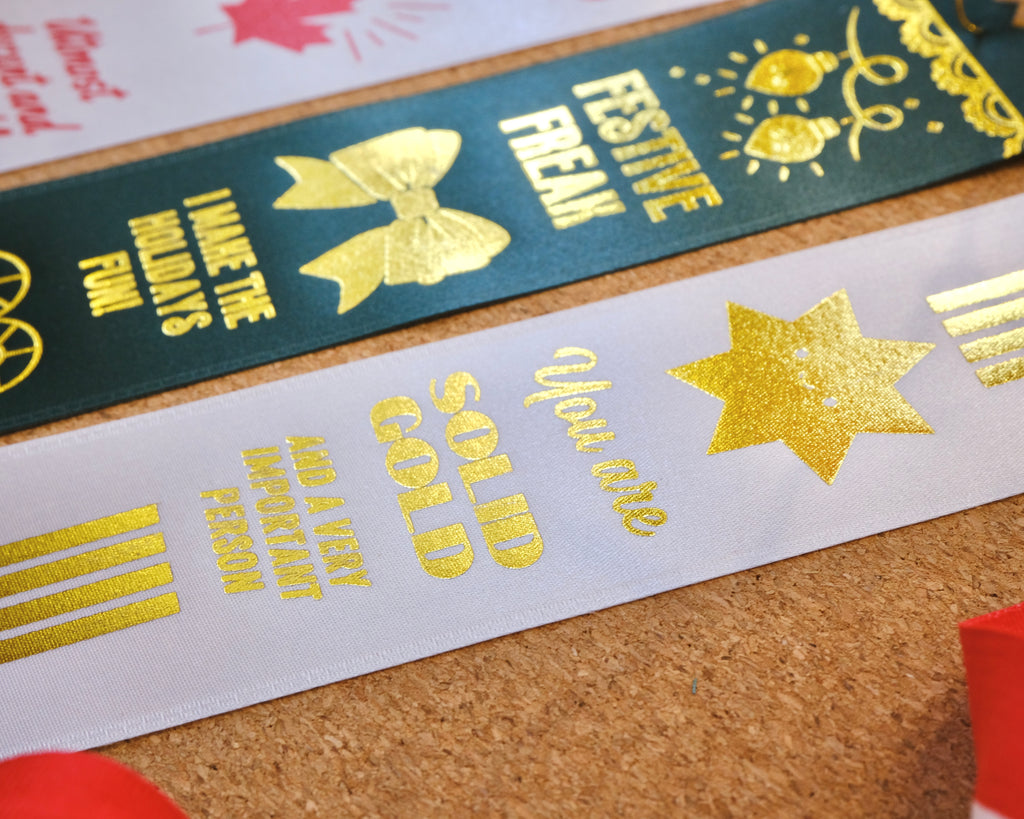 3. Solid Gold: a very important person. Gold print on white ribbon.