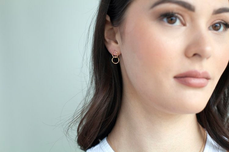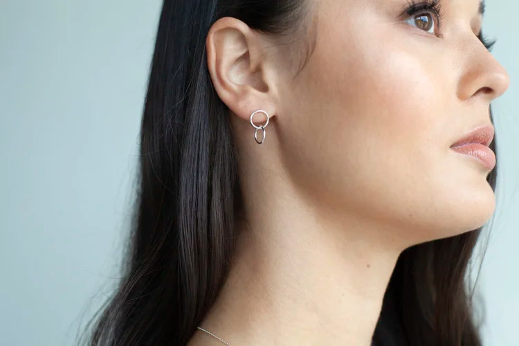 2 interlocking 7.5 mm round links set on a stud style earring.